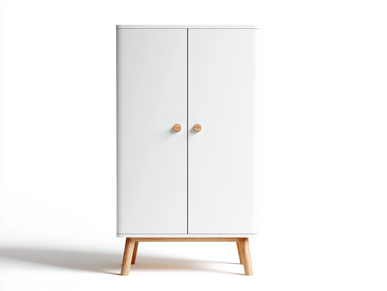 Cette armoire blanche avec pieds en bois au design simple offre un rangement pratique pour la chambre.