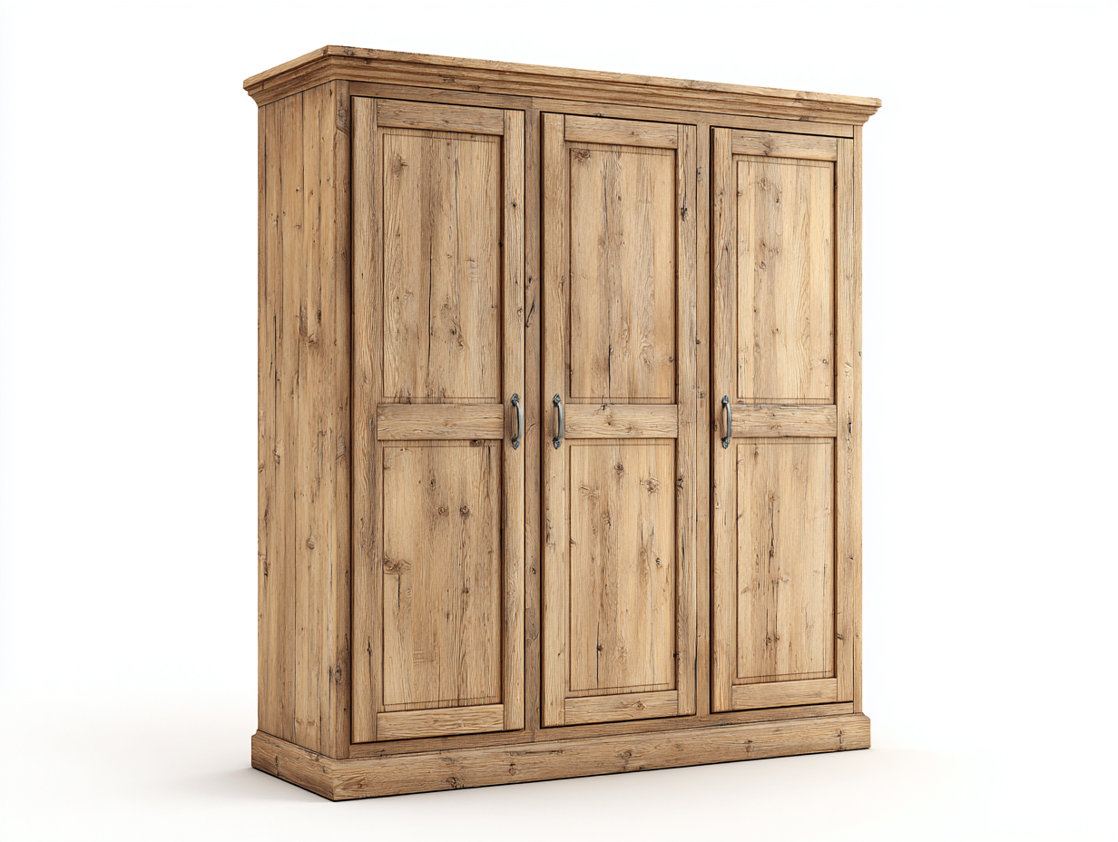 Cette armoire en chêne au style classique offre un vaste espace de rangement pour les vêtements et le linge de maison dans la chambre.