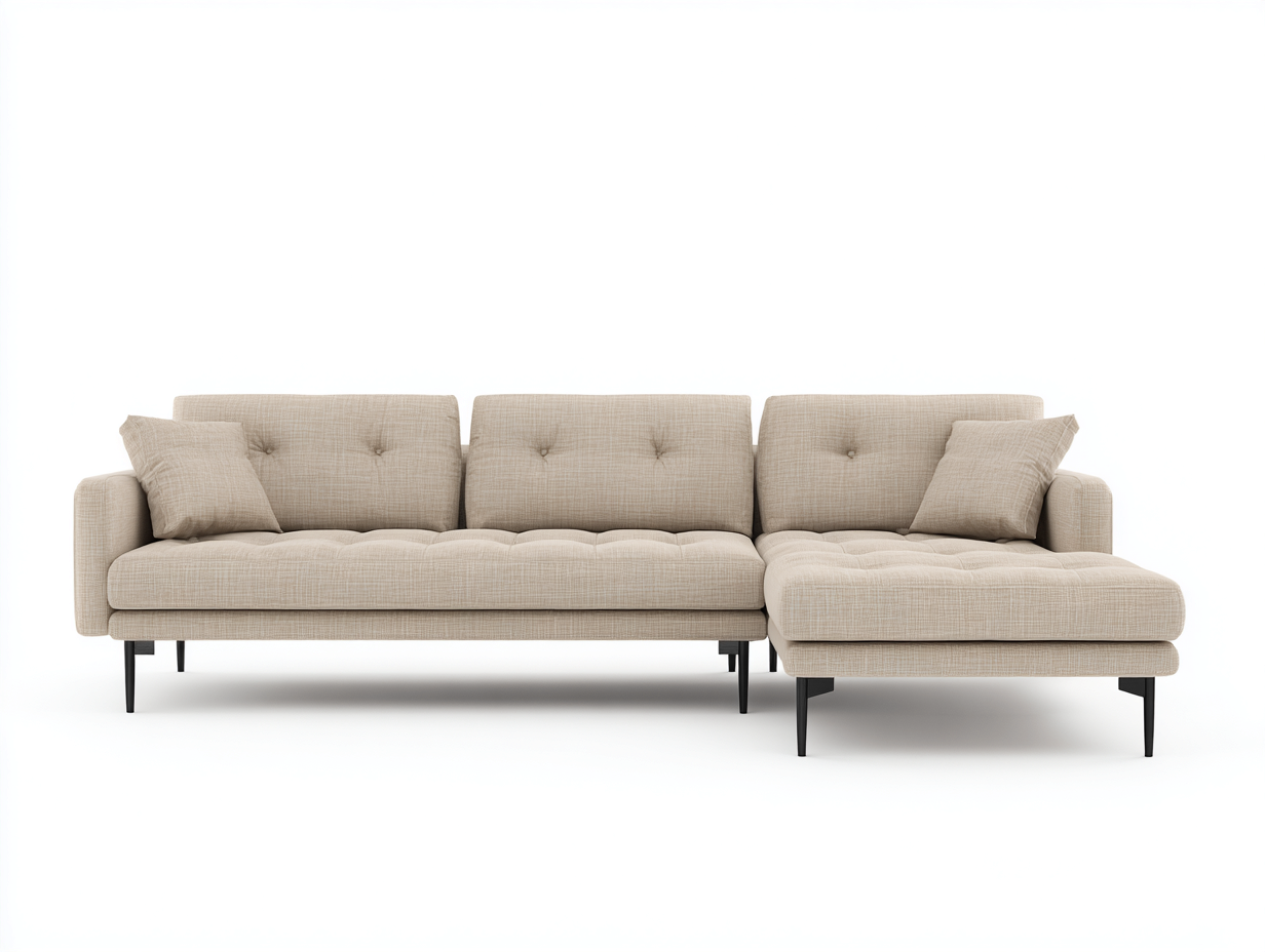 Ce canapé d’angle beige en tissu effet lin offre une assise profonde et confortable.